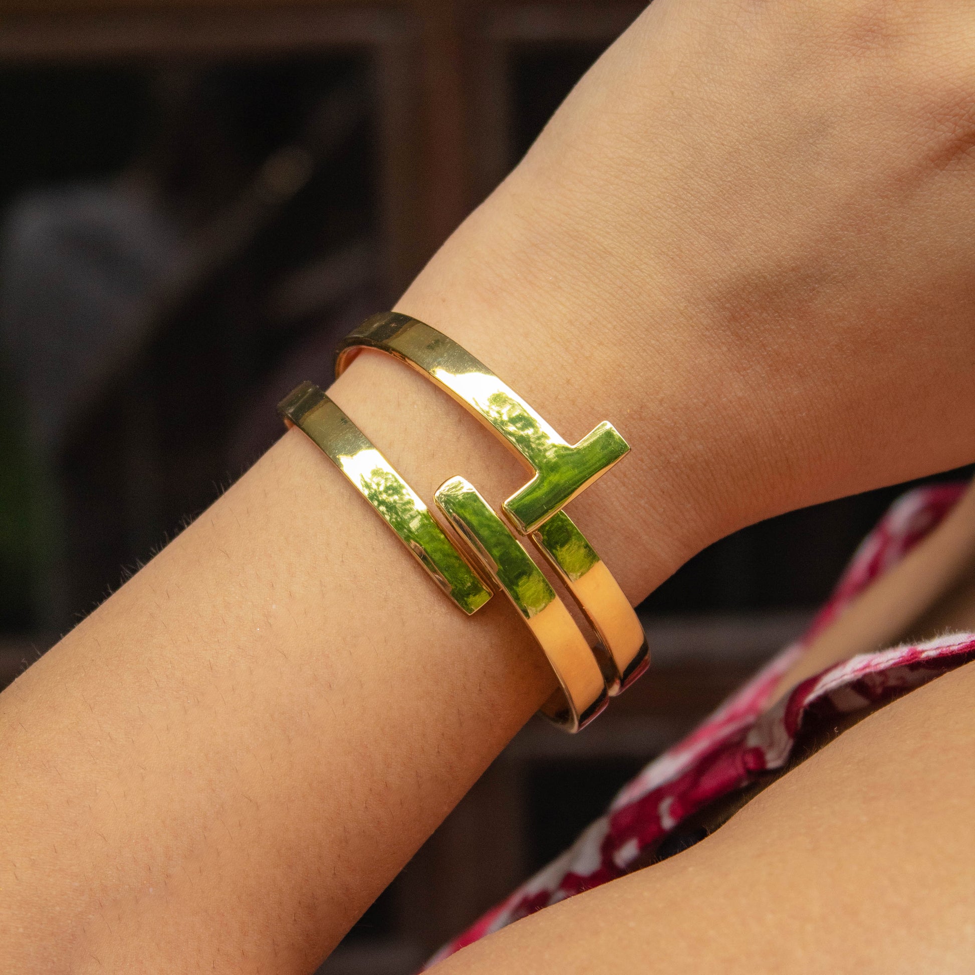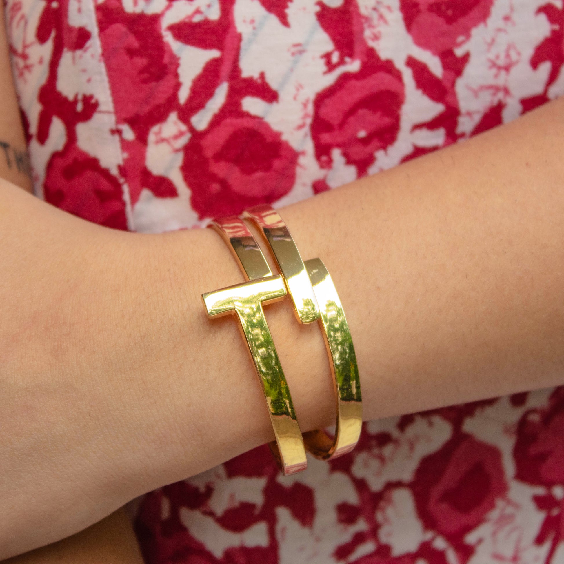 Embrace the elegance of our T cuff bangle bracelet, a must-have for your busy lifestyle. This versatile piece adds a 1-Of-a-Kind effortless look that is sure to turn heads and make a statement. Get noticed and make a difference with this simple yet stunning accessory.