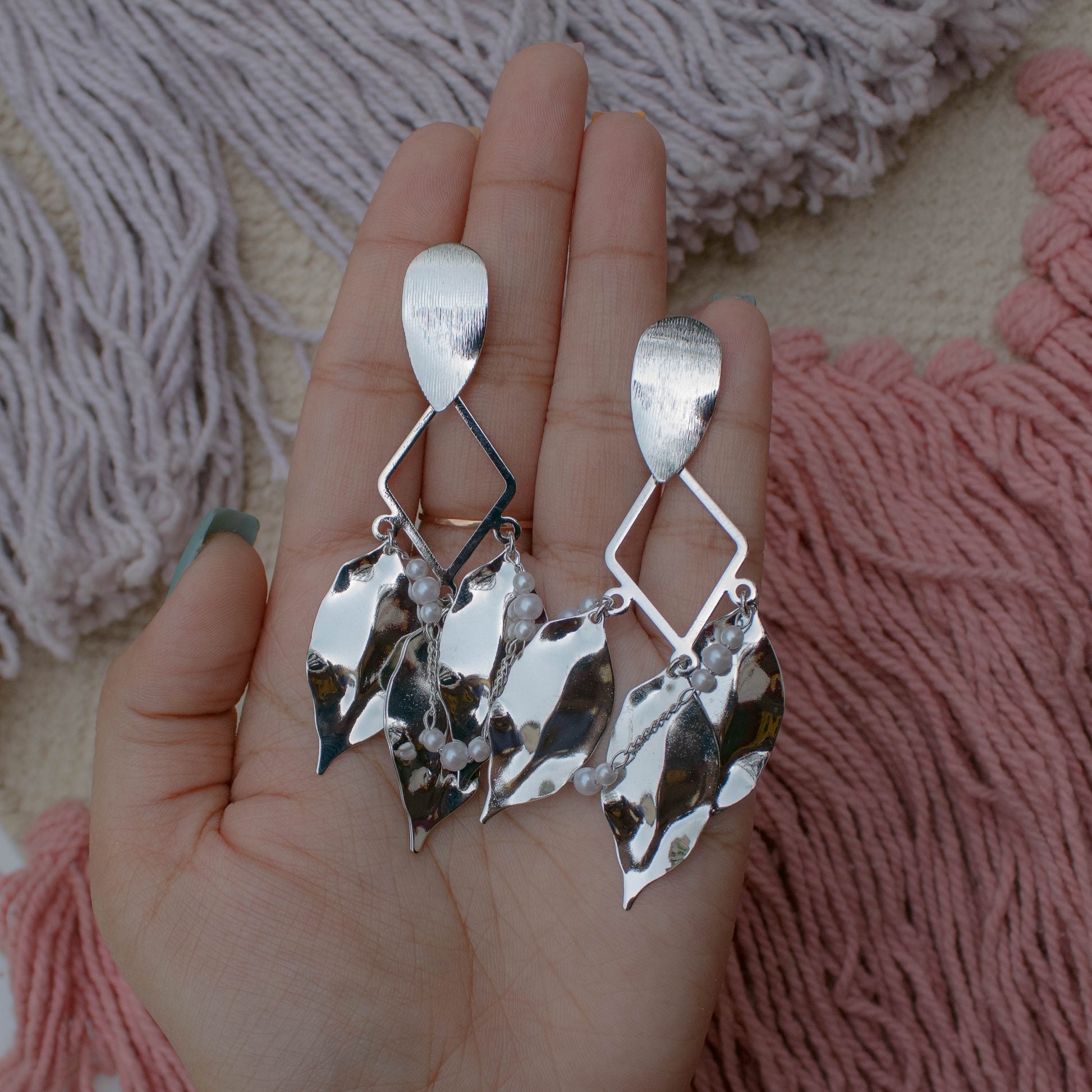 These leaf-inspired drop motifs with a pearl touch bring a stylish transformation to everyday earrings, creating an elegant pair with a touch of playfulness. The movement of the drops adds a lively charm. These earrings complement various outfits splendidly, including boho denims, sleek dresses, and crisp shirts.