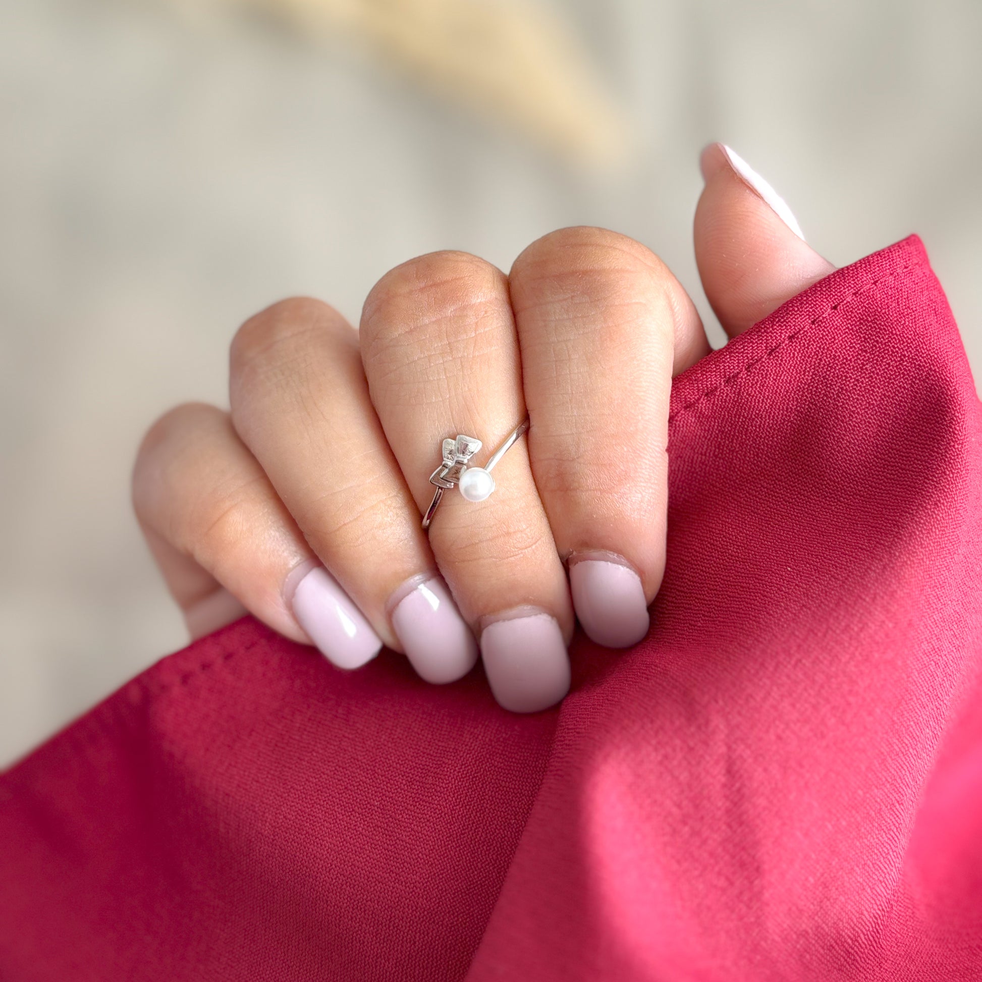 Add a touch of whimsy with our Silver Bows Pearl Ring. This adjustable ring features two delicate silver bows paired with a radiant pearl. It's a charming and elegant piece that brings a playful yet sophisticated flair to any outfit.