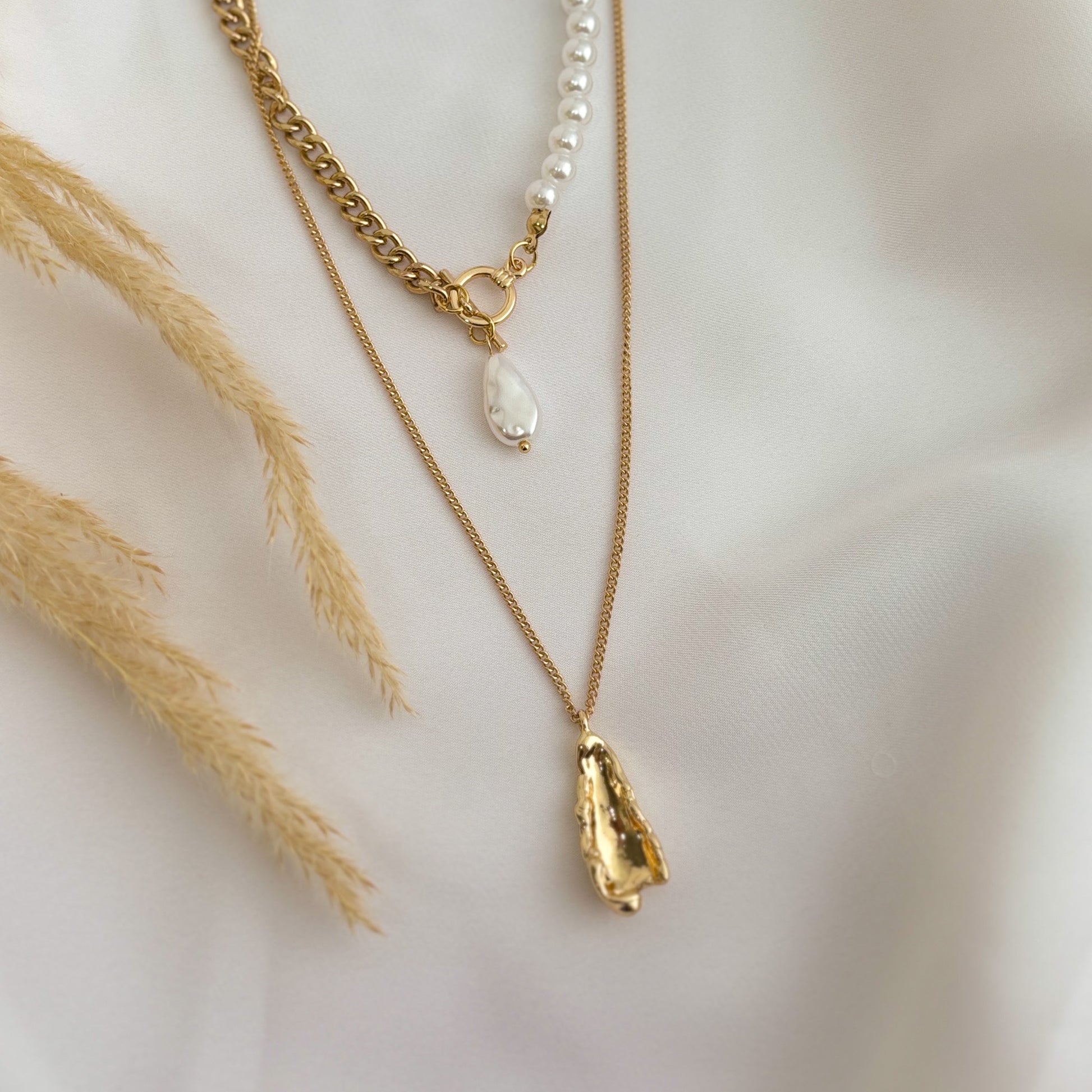 This stunning two-layered necklace features a unique design with the shorter layer combining half gold chain and half pearls, adding a touch of sophistication. The longer layer showcases a sleek gold chain adorned with an abstract aesthetic charm, creating a modern and artistic look. Lightweight and versatile, the Abstract Elegance Necklace effortlessly elevates any outfit, making it perfect for both everyday wear and special occasions. Embrace contemporary style with this beautifully layered piece.