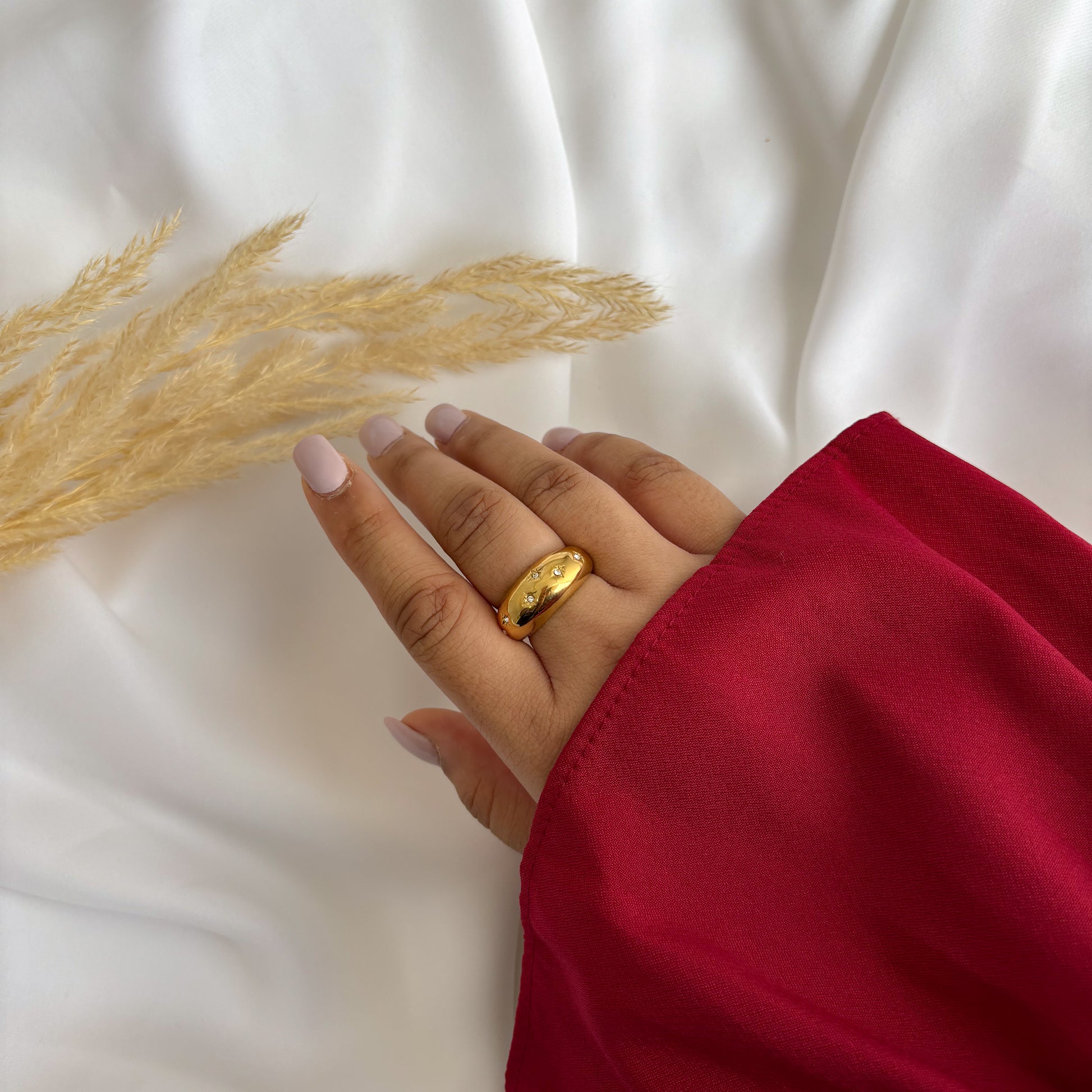 This beautiful gold ring is adorned with cubic zirconia stones that twinkle like stars, adding a touch of celestial elegance to your jewelry collection. Lightweight and versatile, it effortlessly enhances any outfit, making it perfect for both everyday wear and special occasions. The Stellar Sparkle Ring is a dazzling accessory that brings a bit of starlight to your style.