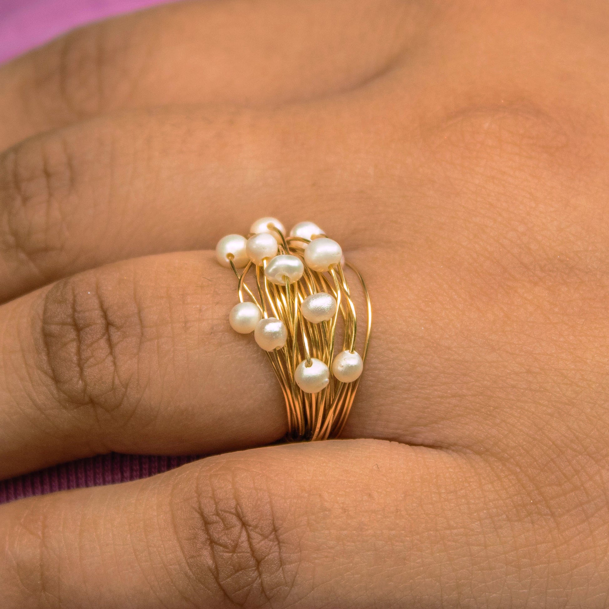 Introducing our "Elegant Pearl Weave Ring," a captivating accessory that showcases small pearls delicately set within multiple gold wires. This unique and elegant design exudes grace and refinement, making it a perfect complement to any outfit. The combination of pearls and gold wires creates a timeless and sophisticated look, making this ring a cherished addition to your jewelry collection. Elevate your style with the understated beauty of our Elegant Pearl Weave Ring.