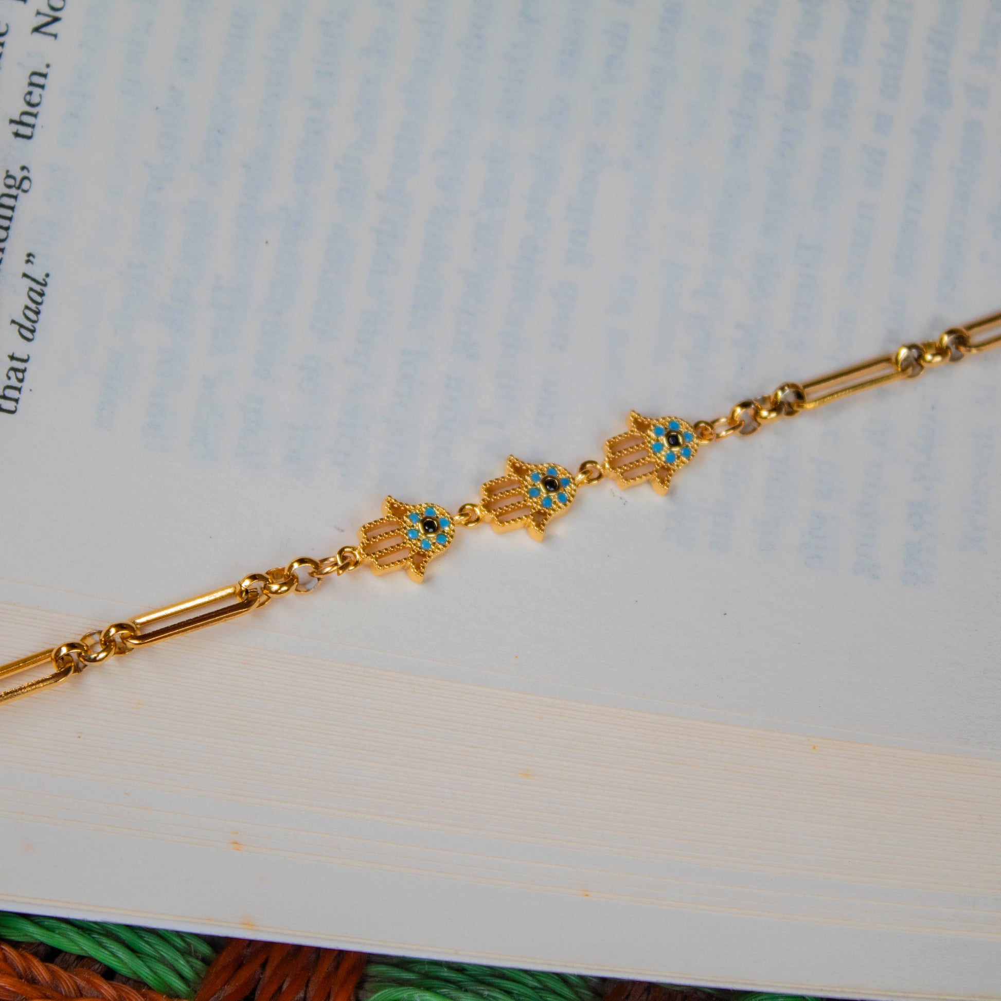 Trio of Hamsa Charms linked together in a Gold Bracelet