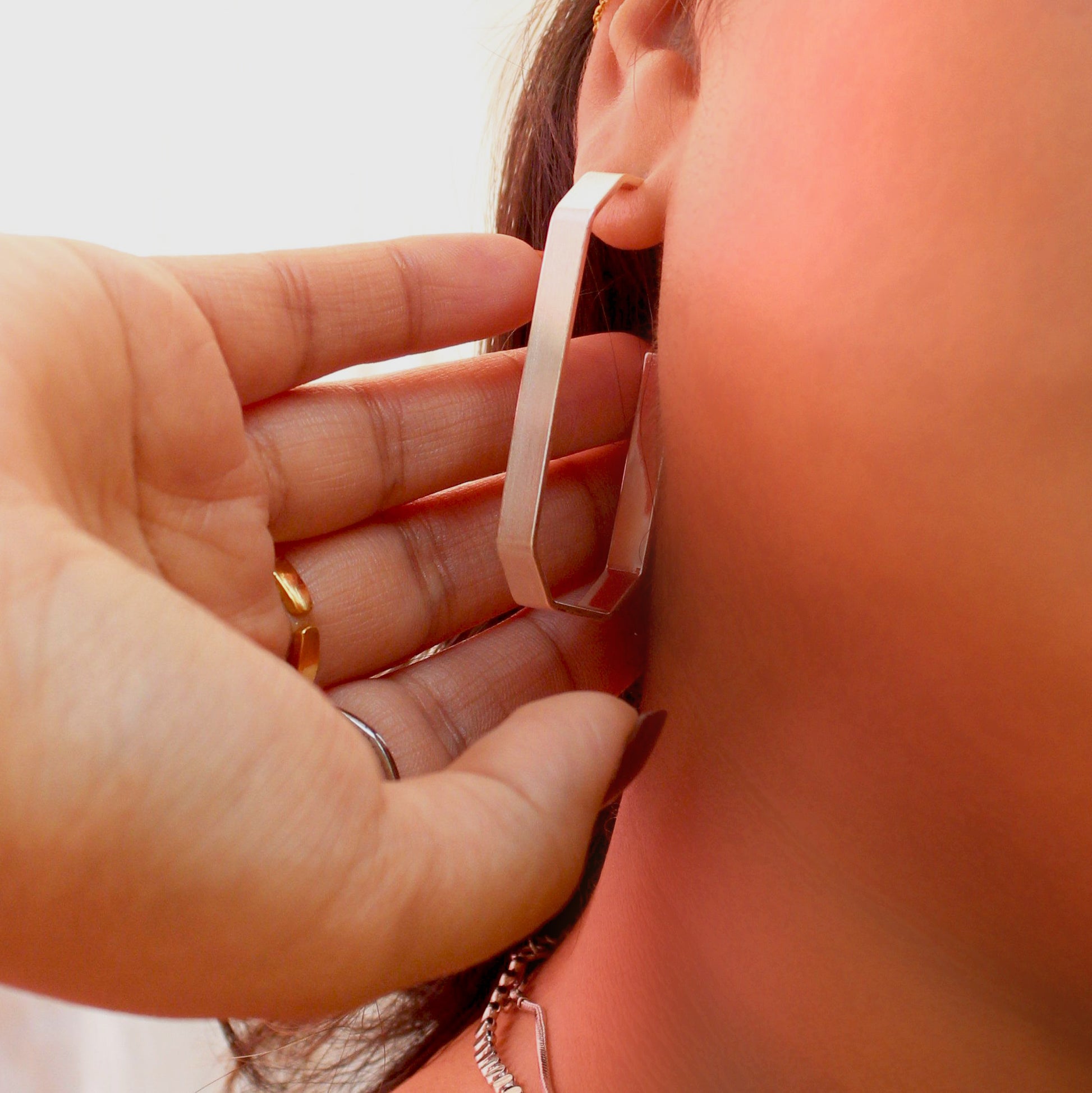 Sleek geometric earrings with rectangular edges.
